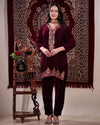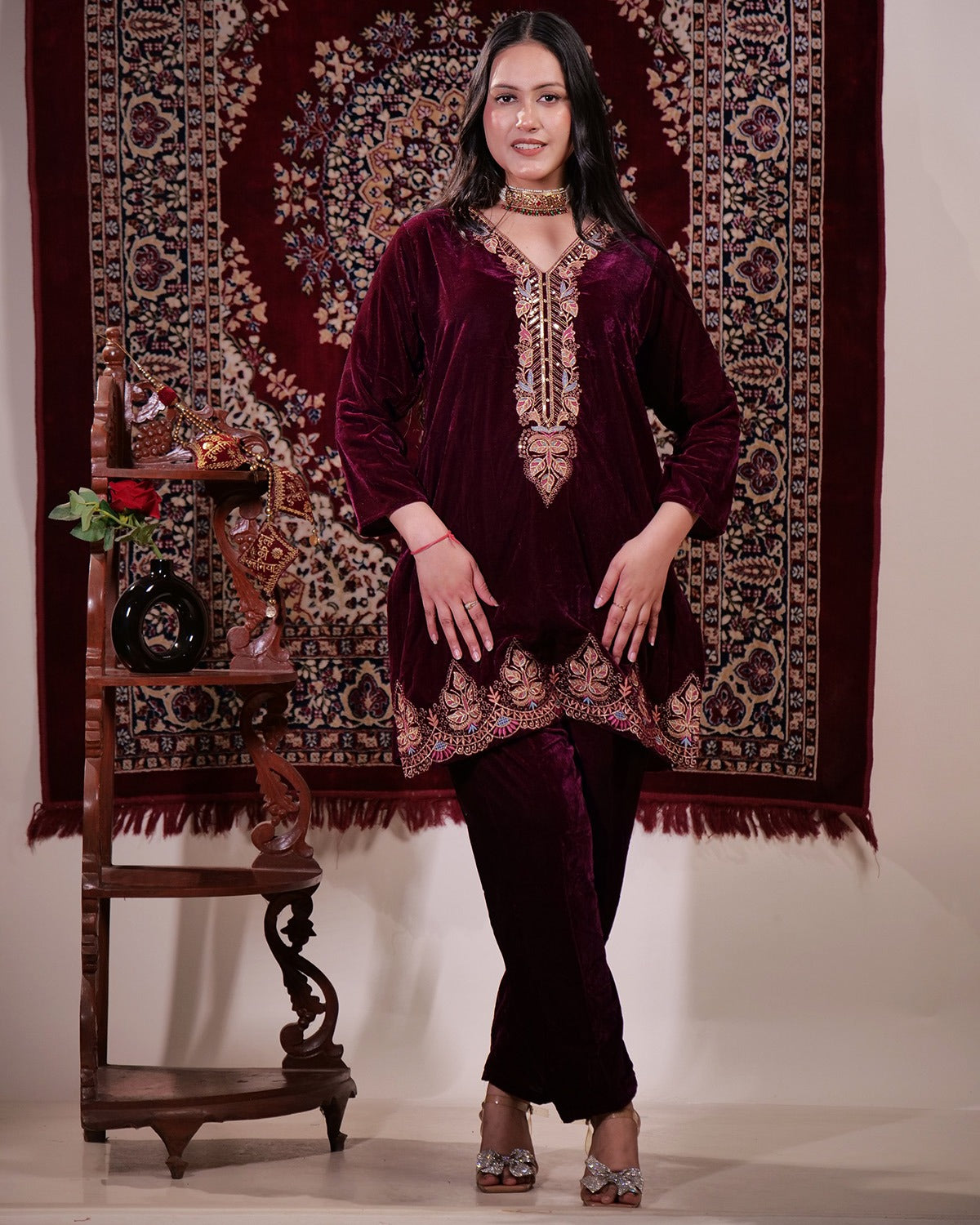 Elevate your ethnic wardrobe with this exquisite velvet co-ord set, meticulously crafted with intricate thread work detailing. The luxurious velvet fabric drapes beautifully while the ornate embroidery adds sophistication and dimension to every wear. Perfect for festive occasions, celebrations, or when you desire an elevated traditional look. The coordinated top and bottom ensemble ensures effortless styling without compromising on elegance. Ideal for those who appreciate fine craftsmanship and timeless design.